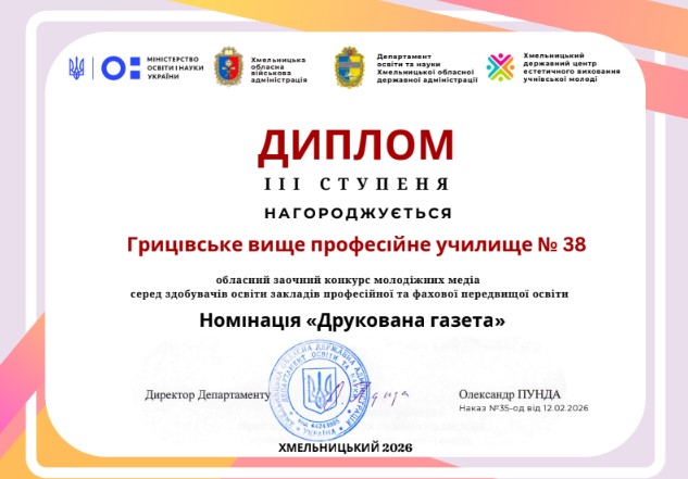 Вітаємо переможця обласного заочного конкурсу молодіжних медіа серед здобувачів освіти закладів професійної та фахової передвищої освіти студента II курсу Арсена Максимчука у номінації