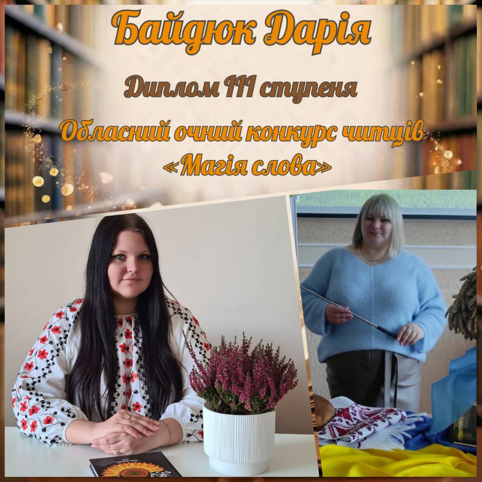 З величезним задоволенням вітаємо Дарію Байдюк та її наставницю Анжелу Максимчук з Диплом ІІІ ступеня у номінації «Твори класиків української літератури».
